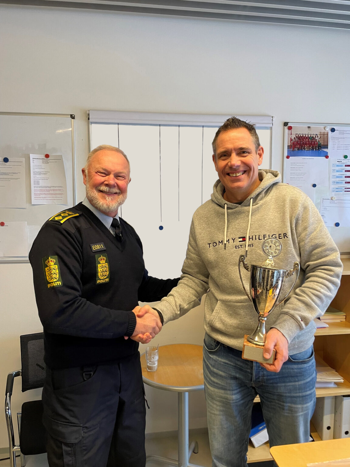 Idet alle spillerne på holdet er tjenestegørende rundt om i hele Danmark, besluttede vi i Dansk Politiidrætsforbund, at holdets træner Torben Nielsen skulle have overrakt prisen på vegne af holdet. Torben er til dagligt tjenestegørende i Københavns Vestegns politi.