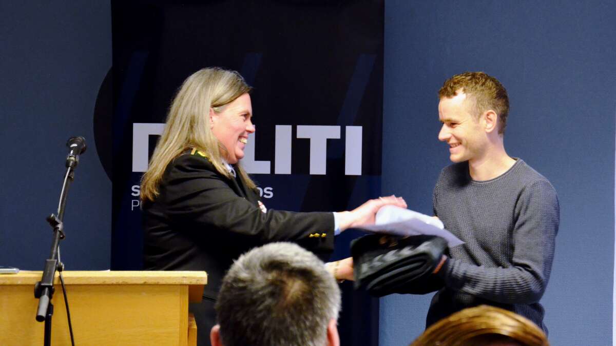 Politidirektør Henriette Rosenberg Larsen overrakte prisen til Eskil i forbindelse med nytårsparolen i Sydøstjyllands politi.