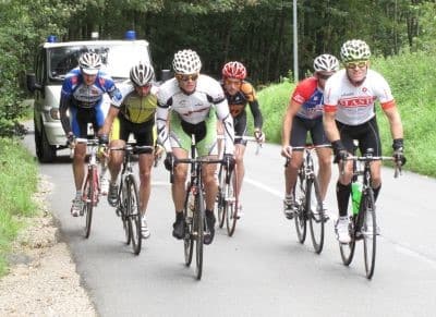 Foto af førerfeltet i herre mesterklassen i færd med at forcere bakken i Rugballegård Skov.