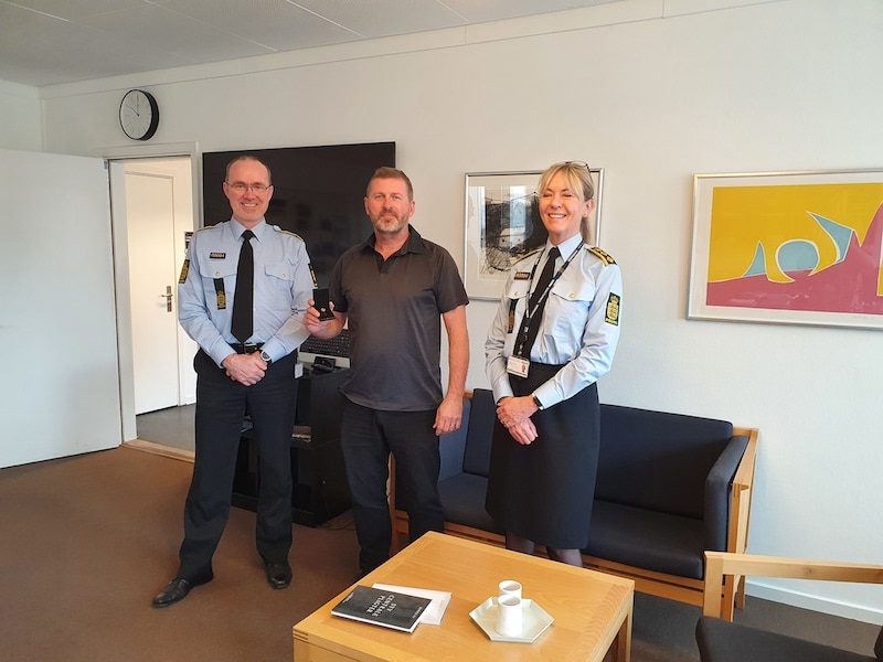Foto: Chefpolitiinspektør Karsten Hansen, Jens Møller Søgaard og politidirektør Anne Marie Roum Svendsen.